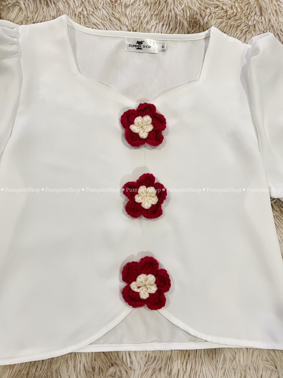 306 Views โปรเสื้อครอปเก๋สุดปัง! 💥 ครอปสั้นสีแดงแต่งกระดุมดอกไม้ คอดินสอ แขนตุ๊กตา