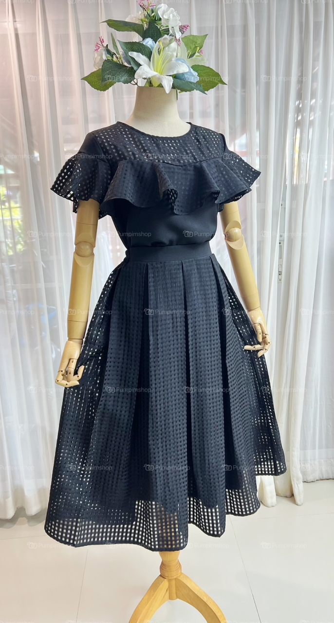กระโปรงจีบทวิต ผ้าแก้วลายตาราง