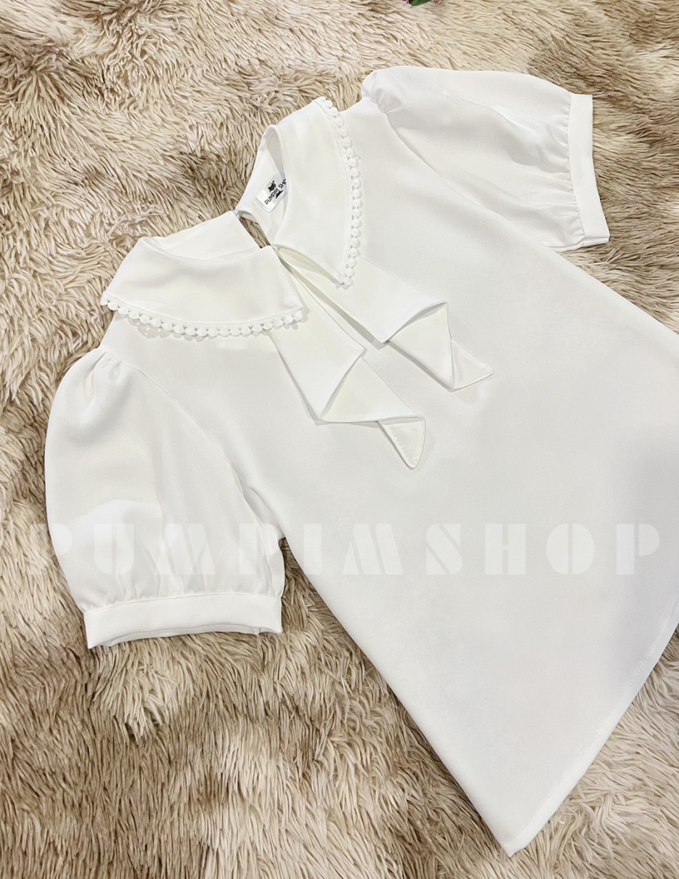 เสื้อคอปกเย็บเป็นโบว์ แต่งขอบปกลูกไม้ปอม แขนพองตุ๊กตาสุดคิ้วท์ ใส่แล้วดูแพงแบบ effortless!