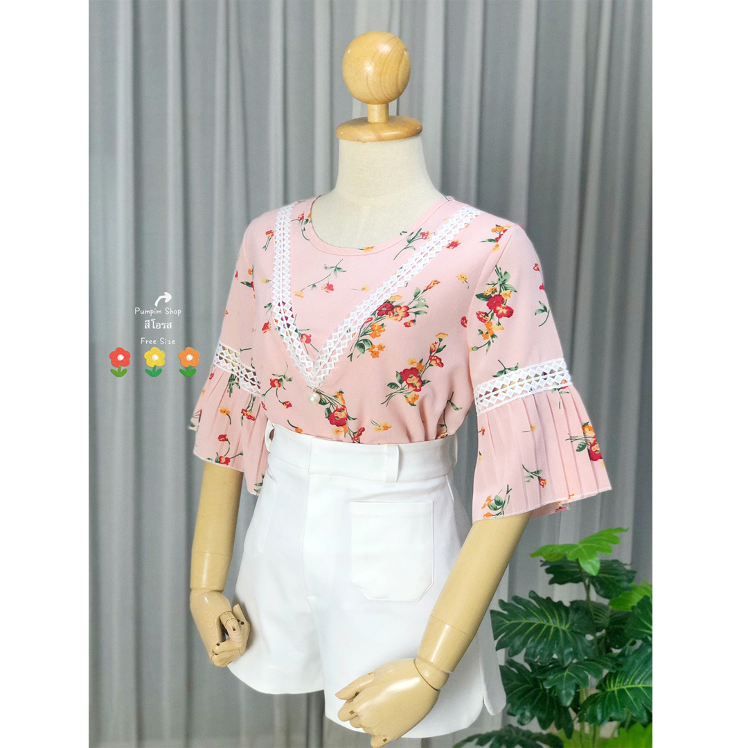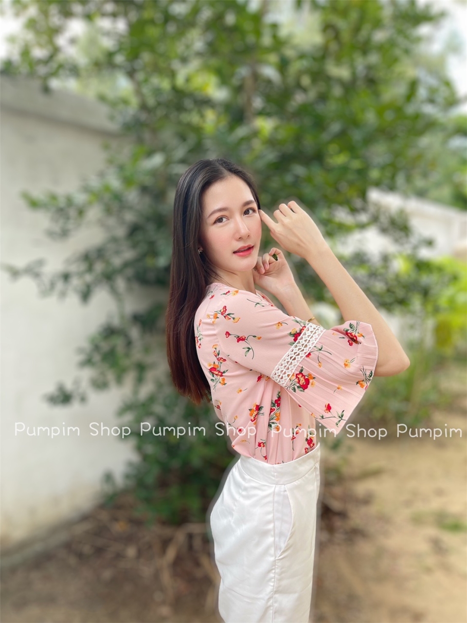 เสื้อลายดอกไม้ แต่งตุ้มมุก แขนระบายอัดพลีท