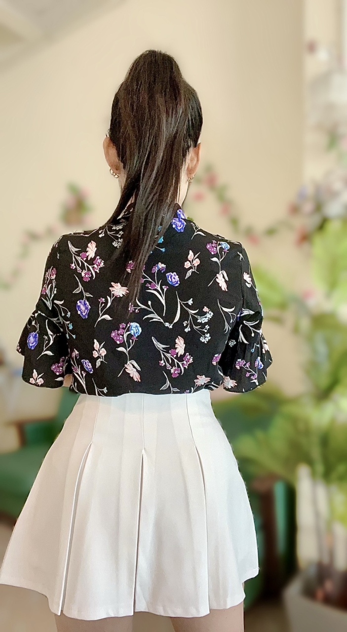เสื้อลายดอกเล็กๆคอผูก แขนระบายอัดพลีท